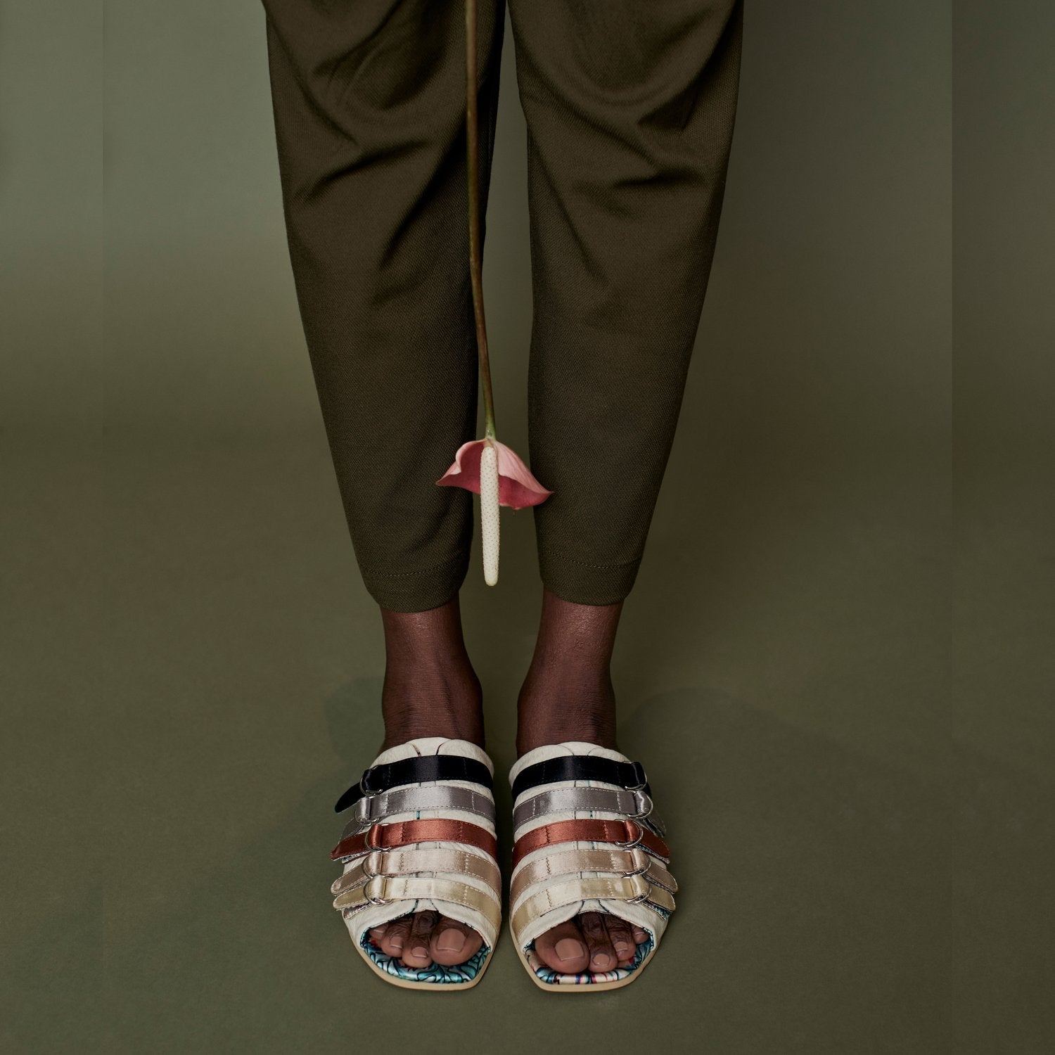 This lively mule flat style with a slightly squared toe came to life by wanting something easy to put/take off while mixing colours, textures and bio materials to have that perfect pair for day-to-night adventures!
