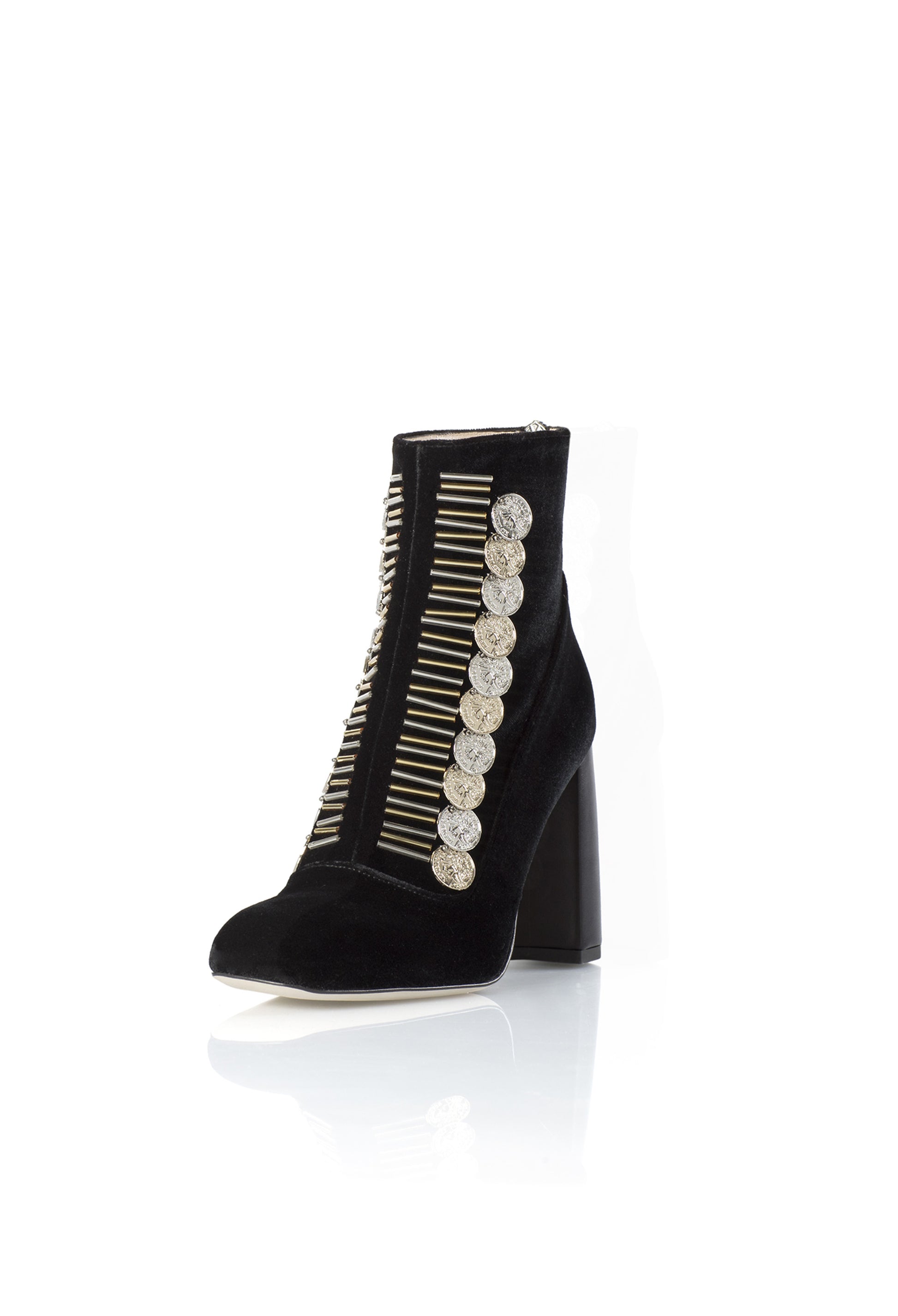 The Traviata booties will give you that boost of confidence. They are lively yet elegant & comfortable with a blocky heel. Featuring customized hand-sewn metal coins & beads giving them a unique touch to make them special yet easy to wear with everything.